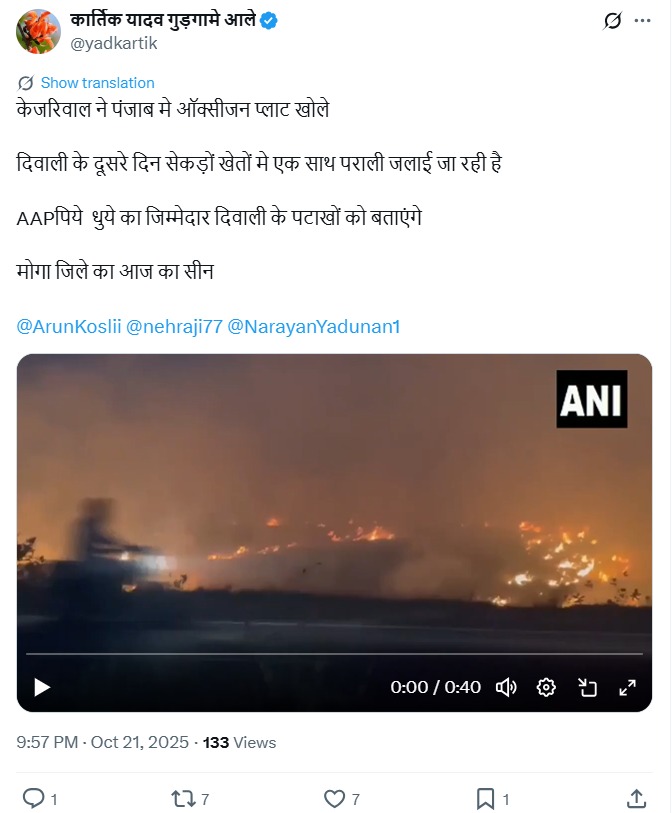 कार्तिक यादव गुड़गामे आले नामक यूजर ने वीडियो को शेयर करते हुए लिखा, ‘केजरिवाल ने पंजाब मे ऑक्सीजन प्लाट खोले दिवाली के दूसरे दिन सेकड़ों खेतों मे एक साथ पराली जलाई जा रही है AAPपिये धुये का जिम्मेदार दिवाली के पटाखों को बताएंगे मोगा जिले का आज का सीन’