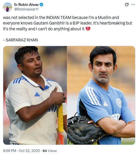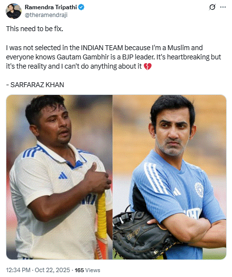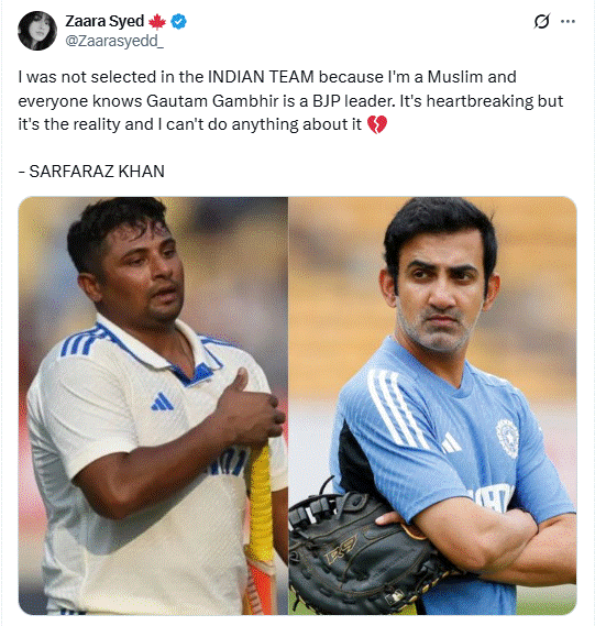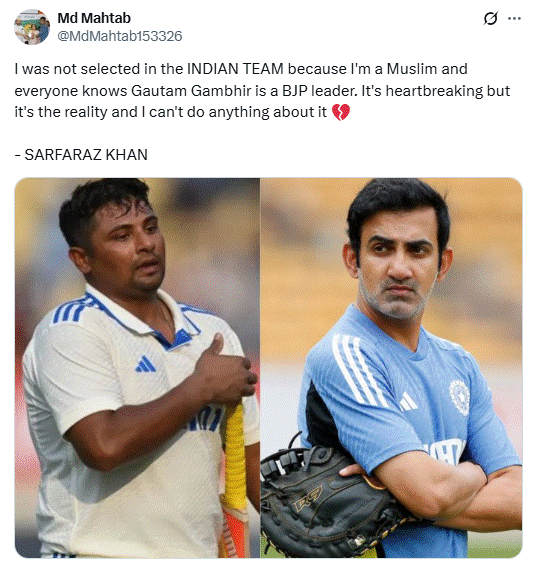 सोशल साईट X पर वेरिफाइड यूजर रामेंद्र त्रिपाठी ने सरफराज खान और गौतम गंभीर की तस्वीर को शेयर कर लिखा कि इसे ठीक करने की आवश्यकता है, मुझे भारतीय टीम में इसलिए नहीं चुना गया क्योंकि मैं मुसलमान हूँ और सब जानते हैं कि गौतम गंभीर भाजपा नेता हैं। यह दिल तोड़ने वाला है, लेकिन यही सच्चाई है और मैं इसमें कुछ नहीं कर सकता – सरफ़राज़ ख़ान