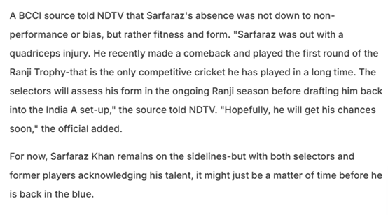 ऐसे में हमने जांच को आगे बढ़ाया। इस दौरान हमें एनडीटीवी की एक रिपोर्ट मिली जिसमें भारतीय क्रिकेट कंट्रोल बोर्ड (BCCI) के एक सूत्र ने एनडीटीवी को बताया कि सरफराज की अनुपस्थिति उनके खराब प्रदर्शन या पक्षपात के कारण नहीं, बल्कि उनकी फिटनेस और फॉर्म के कारण थी। सूत्र ने एनडीटीवी को बताया, “सरफराज क्वाड्रिसेप्स की चोट के कारण बाहर थे। उन्होंने हाल ही में वापसी की और रणजी ट्रॉफी का पहला राउंड खेला—लंबे समय से यही उनका एकमात्र प्रतिस्पर्धी क्रिकेट है। चयनकर्ता उन्हें भारत ए टीम में वापस लेने से पहले मौजूदा रणजी सीज़न में उनके फॉर्म का आकलन करेंगे।” अधिकारी ने आगे कहा, “उम्मीद है कि उन्हें जल्द ही मौके मिलेंगे।”