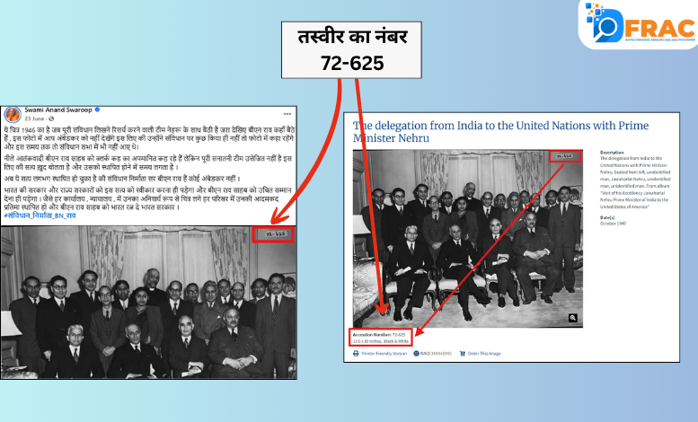DFRAC के फैक्ट चेक से साफ है कि सोशल मीडिया पर शेयर की तस्वीर वर्ष 1946 में संविधान सभा की बैठक की नहीं है। यह तस्वीर अक्टूबर 1949 में तत्कालीन प्रधानमंत्री जवाहरलाल नेहरू की संयुक्त राष्ट्र में भारत के प्रतिनिधिमंडल की है। इसलिए यूजर्स का दावा भ्रामक है।