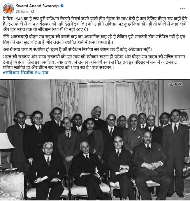 इस तस्वीर को शेयर करते हुए Swami Anand Swaroop नामक यूजर ने लिखा, ‘ये चित्र 1946 का है जब पूरी संविधान लिखने रिसर्च करने वाली टीम नेहरू के साथ बैठी है जरा देखिए बीएन राव कहाँ बैठे हैं , इस फोटो में आप अंबेडकर को नहीं देखेंगे इस लिए की उन्होंने संविधान पर कुछ किया ही नहीं तो फोटो में कहा रहेंगे और इस समय तक तो संविधान सभा में भी नहीं आए थे। नीले आतंकवादी बीएन राव साहब को क्लर्क कह का अपमानित कह रहे हैं लेकिन पूरी सनातनी टीम उत्तेजित नहीं है इस लिए की सत्य ख़ुद बोलता है और उसको स्थापित होने में समय लगता है। अब ये सत्य लगभग स्थापित हो चुका है की संविधान निर्माता सर बीएन राव हैं कोई अंबेडकर नहीं। भारत की सरकार और राज्य सरकारों को इस सत्य को स्वीकार करना ही पड़ेगा और बीएन राव साहब को उचित सम्मान देना ही पड़ेगा । जैसे हर कार्यालय , न्यायालय , में उनका अनिवार्य रूप से चित्र लगे हर परिसर में उनकी आदमकद प्रतिमा स्थापित हो और बीएन राव साहब को भारत रत्न दे भारत सरकार।’