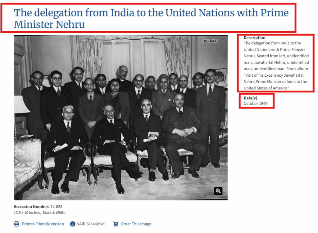 DFRAC की टीम ने वायरल तस्वीर की जांच के लिए गूगल लेंस की मदद से रिवर्स इमेज सर्च किया। हमें यह तस्वीर अमेरिका की हैरी एस. ट्रूमैन प्रेसिडेंशियल लाइब्रेरी एवं संग्रहालय की वेबसाइट पर पोस्ट मिली। इस तस्वीर के साथ जानकारी दी गई है कि यह अक्टूबर 1949 में तत्कालीन प्रधानमंत्री जवाहरलाल नेहरू के साथ संयुक्त राष्ट्र में भारत के प्रतिनिधिमंडल की तस्वीर है। इस तस्वीर के साथ डिस्क्रिप्शन लिखा गया है, ‘प्रधानमंत्री नेहरू के साथ संयुक्त राष्ट्र में भारत का प्रतिनिधिमंडल। बाईं ओर से बैठे हैं, एक अनजान आदमी, जवाहरलाल नेहरू, एक अनजान आदमी, एक अनजान आदमी। एल्बम “हिज़ एक्सीलेंसी जवाहरलाल नेहरू, भारत के प्रधानमंत्री का संयुक्त राज्य अमेरिका का दौरा” से।’ (हिन्दी अनुवाद)