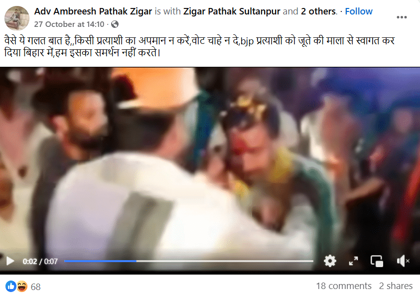 बिहार विधानसभा चुनाव के लिए प्रत्याशी जोर-शोर से चुनाव प्रचार कर रहे हैं। इस बीच सोशल मीडिया पर एक वीडियो इस दावे के साथ वायरल हो रहा है कि बिहार में जनता ने बीजेपी प्रत्याशी का जूते की माला पहनाकर स्वागत किया। इस वीडियो में देखा जा सकता है कि हाथ जोड़ रहे एक प्रत्याशी को एक शख्स जूते की माला पहना देता है।