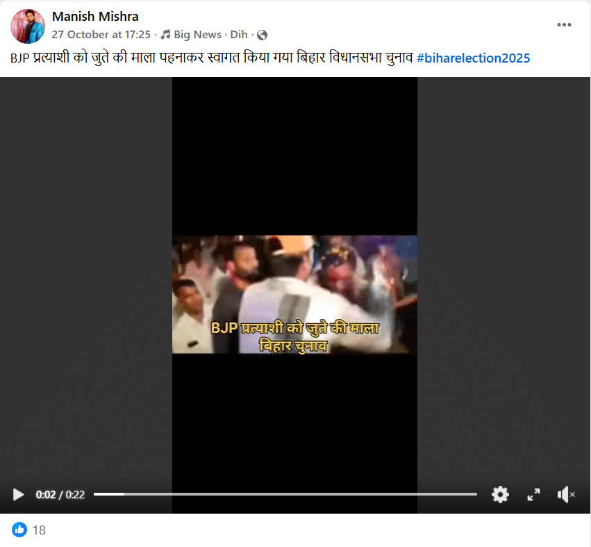 इस वीडियो को शेयर करते हुए Manish Mishra नामक एक फेसबुक यूजर ने लिखा, ‘BJP प्रत्याशी को जुते की माला पहनाकर स्वागत किया गया बिहार विधानसभा चुनाव #biharelection2025‘