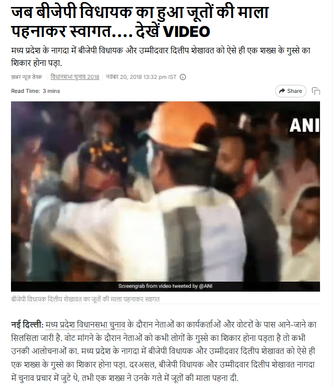 वहीं हमें इस घटना के बारे में एनडीटीवी की भी वर्ष 2018 की एक रिपोर्ट मिली, जिसमें बताया गया है, ‘मध्य प्रदेश के नागदा में बीजेपी विधायक और उम्मीदवार दिलीप शेखावत को ऐसे ही एक शख्स के गुस्से का शिकार होना पड़ा. दरअसल, बीजेपी विधायक और उम्मीदवार दिलीप शेखावत नागदा में चुनाव प्रचार में जुटे थे, तभी एक शख्स ने उनके गले में जूतों की माला पहना दी। पहले तो विधायक समझ नहीं पाते हैं और वह माला पहन लेते हैं, मगर बाद में जैसे ही उन्हें लगता है कि शख्स ने जूते की माला पहनाई है, वह आग बबूला हो जाते हैं और उस शख्स पर टूट पड़ते हैं।’