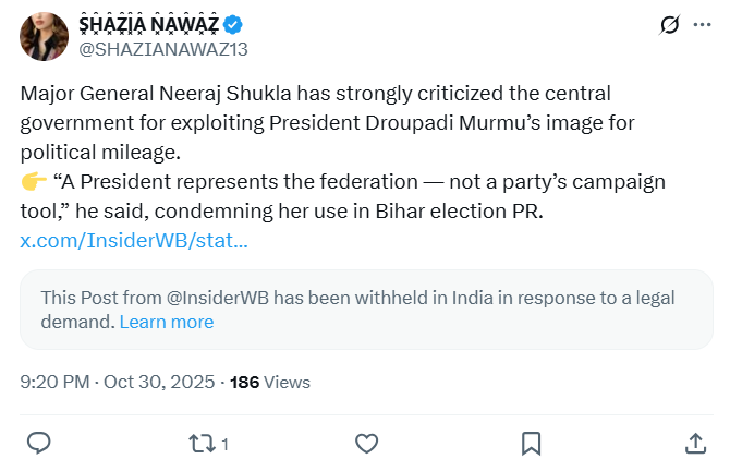 इस वीडियो को शेयर करते हुए शाजिया नवाज नामक यूजर ने अंग्रेजी भाषा में कैप्शन लिखा, जिसका हिन्दी अनुवाद है, ‘मेजर जनरल नीरज शुक्ला ने राजनीतिक फायदे के लिए राष्ट्रपति द्रौपदी मुर्मू की इमेज का इस्तेमाल करने के लिए केंद्र सरकार की कड़ी आलोचना की है। उन्होंने कहा, “एक राष्ट्रपति पूरे देश का प्रतिनिधित्व करता है – न कि किसी पार्टी के कैंपेन का टूल होता है,” और बिहार चुनाव के PR में उनके इस्तेमाल की निंदा की।’