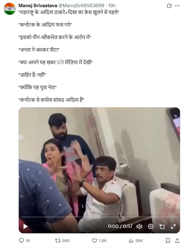 इस वीडियो को शेयर कर मनोज श्रीवास्तव नामक यूजर ने लिखा, ‘महाराष्ट्र के आदित्य ठाकरे+दिशा का केस खुलने से पहले कर्नाटक के आदित्य फस गये, इसको यौन-ब्लैकमेल करने के आरोप में जनता ने जमकर पीटा. क्या आपने यह खबर #डी मीडिया में देखी, ज़ाहिर है-नहीं, क्योंकि यह युवा नेता कर्नाटक से कांग्रेस सांसद आदित्य हैं।’