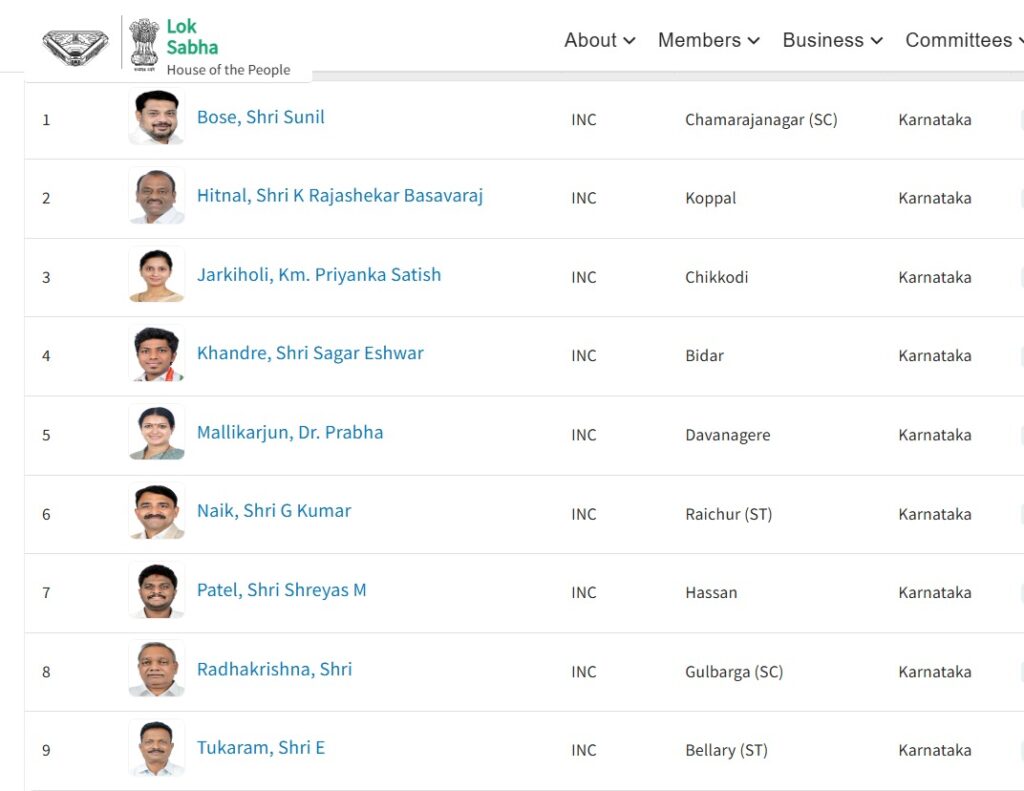 DFRAC की टीम ने वायरल दावे की जांच में पाया कि कर्नाटक में आदित्य नाम का कोई कांग्रेस सांसद नहीं है। हमने sansad.in की वेबसाइट पर कर्नाटक से कांग्रेस के लोकसभा सांसदों की लिस्ट देखी। कर्नाटक से कांग्रेस के कुल 9 लोकसभा सांसद हैं, लेकिन इनमें कोई भी सांसद आदित्य नाम का नहीं है।