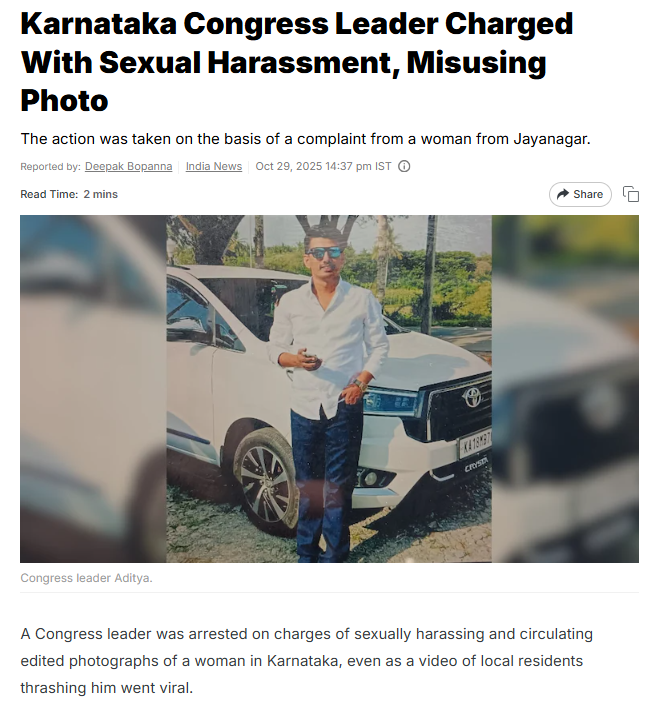 DFRAC के फैक्ट चेक से साफ है कि कर्नाटक में आदित्य नाम का कोई कांग्रेस सांसद नहीं है। दरअसल महिला के यौन उत्पीड़न के आरोप में एक कांग्रेस नेता आदित्य को गिरफ्तार किया गया है। इसलिए यूजर्स का दावा भ्रामक है।
