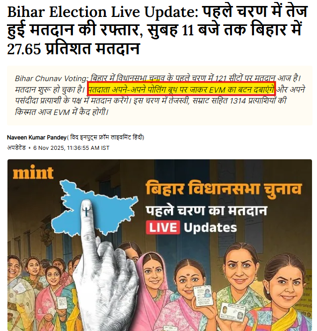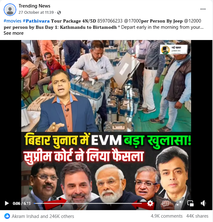 फेसबुक पर वरिष्ठ पत्रकार अभिसार शर्मा का एक वीडियो शेयर किया गया है। इस वीडियो में अभिसार शर्मा को यह न्यूज पढ़ते हुए सुना जा सकता है कि सुप्रीम कोर्ट के चीफ जस्टिस बीआर गवई ने बिहार चुनाव में ईवीएम बैन का ऐतिहासिक फैसला दिया है और अब बिहार में बैलट पेपर से चुनाव होंगे। ईवीएम बैन के इस फैसले का तेजस्वी यादव और राहुल गांधी सहित तमाम विपक्षी नेताओं ने स्वागत किया है।