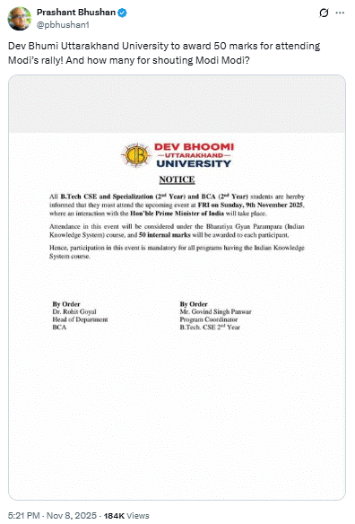 सोशल साईट X पर वरिष्ठ अधिवक्ता प्रशांत भूषण ने वायरल लेटर को शेयर कर लिखा कि देवभूमि उत्तराखंड विश्वविद्यालय मोदी की रैली में शामिल होने पर 50 अंक देगा! और मोदी-मोदी चिल्लाने पर कितने अंक?