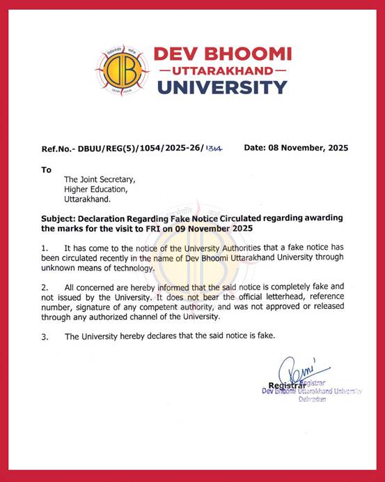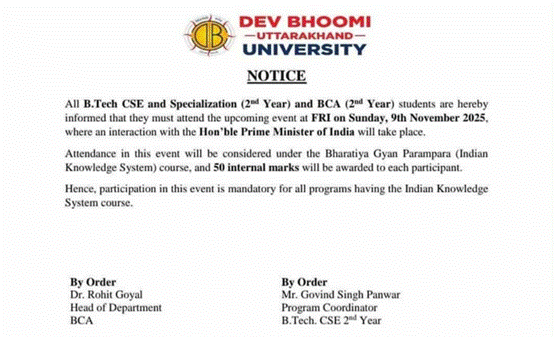 वायरल लेटर पर लिखा है कि सूचना सभी बी.टेक. सीएसई एवं विशेषज्ञता (द्वितीय वर्ष) तथा बीसीए (द्वितीय वर्ष) के छात्रों को सूचित किया जाता है कि वे रविवार, 9 नवंबर 2025 को एफआरआई में आयोजित होने वाले आगामी कार्यक्रम में अवश्य शामिल हों, जहाँ भारत के माननीय प्रधानमंत्री के साथ बातचीत होगी। इस कार्यक्रम में उपस्थिति को भारतीय ज्ञान परंपरा पाठ्यक्रम के अंतर्गत माना जाएगा और प्रत्येक प्रतिभागी को 50 आंतरिक अंक दिए जाएँगे। अतः, भारतीय ज्ञान प्रणाली पाठ्यक्रम वाले सभी कार्यक्रमों के लिए इस कार्यक्रम में भाग लेना अनिवार्य है। आदेशानुसार डॉ. रोहित गोयल विभागाध्यक्ष, बीसीए आदेशानुसार श्री गोविंद सिंह पंवार, कार्यक्रम समन्वयक, बी.टेक. सीएसई द्वितीय वर्ष