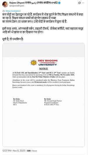 इसके अलावा एक अन्य वेरिफाइड यूजर सोरभ ने वायरल लेटर को शेयर कर लिखा कि गौर कीजिए… देवभूमि उत्तराखंड यूनिवर्सिटी मोदी जी के इवेंट में शामिल होने के लिए अपने बीटेक, BCA छात्रों को इंटरनल EXAM में 50 नंबर देने की बात कह रही है…