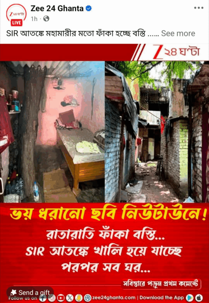 एक पोस्ट में दावा किया गया है कि कोलकाता के न्यू टाउन की झुग्गियाँ “SIR” के डर से खाली हो रही हैं। इस पोस्ट के साथ दो तस्वीरें भी शेयर की गईं। ज़ी न्यूज़ 24 घंटा ने यह पोस्ट बंगाली भाषा में शेयर की। पोस्ट में लिखा था, “SIR, डर की वजह से झुग्गियां महामारी की तरह खाली हो रही हैं… न्यूटाउन में डरावनी तस्वीर! रातों-रात खाली झुग्गी… SIR, डर के मारे सारे घर खाली हो रहे हैं…” (हिन्दी अनुवाद)