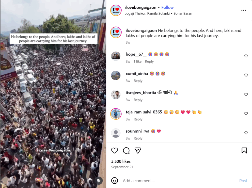 DFRAC की टीम ने जांच में पाया कि वायरल वीडियो बिहार में चुनाव आयोग और बीजेपी के खिलाफ प्रदर्शन का नहीं है। यह वीडियो सितंबर में सिंगर जुबिन गर्ग की अंतिम यात्रा का वीडियो है। इस वीडियो को इंस्टाग्राम पर ilovebongaigaon नामक यूजर ने 21 सितंबर 2025 को पोस्ट किया है।