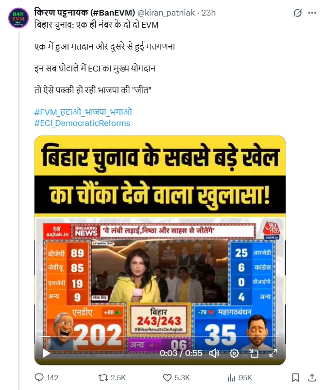 इस वीडियो को शेयर करते हुए एक यूजर ने लिखा, ‘बिहार चुनाव: एक ही नंबर के दो दो EVM. एक में हुआ मतदान और दूसरे से हुई मतगणना. इन सब घोटाले में ECI का मुख्य योगदान तो ऐसे पक्की हो रही भाजपा की “जीत”
