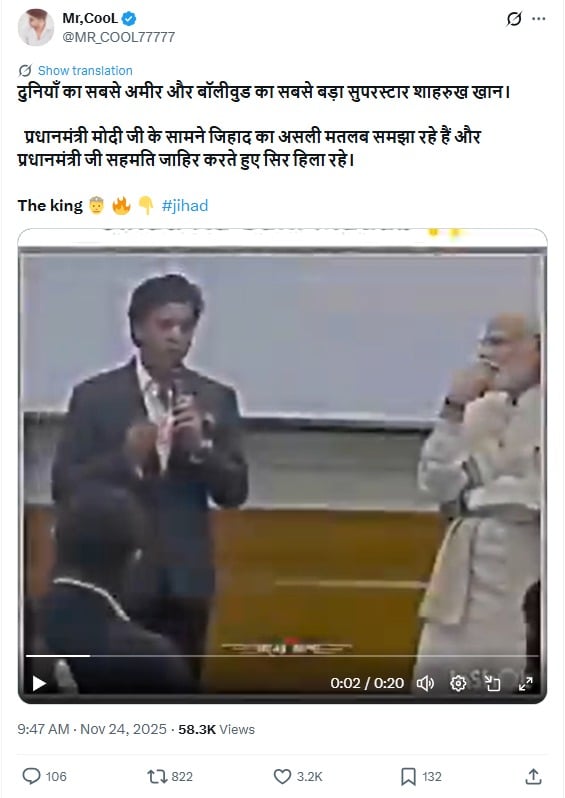 वीडियो शेयर करते हुए मिस्टर कूल नामक यूजर ने लिखा, ‘दुनियाँ का सबसे अमीर और बॉलीवुड का सबसे बड़ा सुपरस्टार शाहरुख खान। प्रधानमंत्री मोदी जी के सामने जिहाद का असली मतलब समझा रहे हैं और प्रधानमंत्री जी सहमति जाहिर करते हुए सिर हिला रहे। The king‘