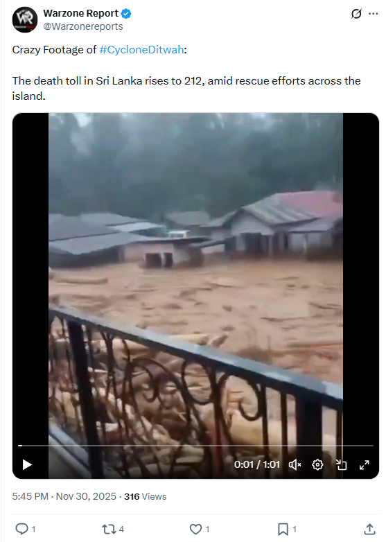 इस वीडियो को शेयर करते हुए एक यूजर ने लिखा, ‘CycloneDitwah का क्रेज़ी फुटेज: पूरे द्वीप पर बचाव कार्य के बीच, श्रीलंका में मरने वालों की संख्या बढ़कर 212 हो गई है।’