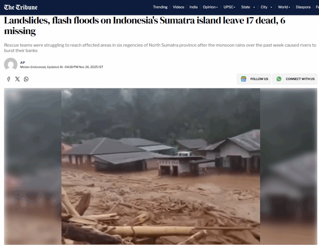 वहीं द ट्रिब्यून की एक रिपोर्ट में भी वायरल वीडियो का स्क्रीनशॉट देखा जा सकता है। द ट्रिब्यून ने अपनी रिपोर्ट में बताया है कि इंडोनेशिया के सुमात्रा द्वीप पर मूसलाधार बारिश से आई अचानक बाढ़ और भूस्खलन के बाद राहत और बचाव कार्य किया गया है। बचावकर्मियों ने और शव बरामद किए। वहीं RT ने भी इस वीडियो को इंडोनेशिया बताते हुए पोस्ट किया है।