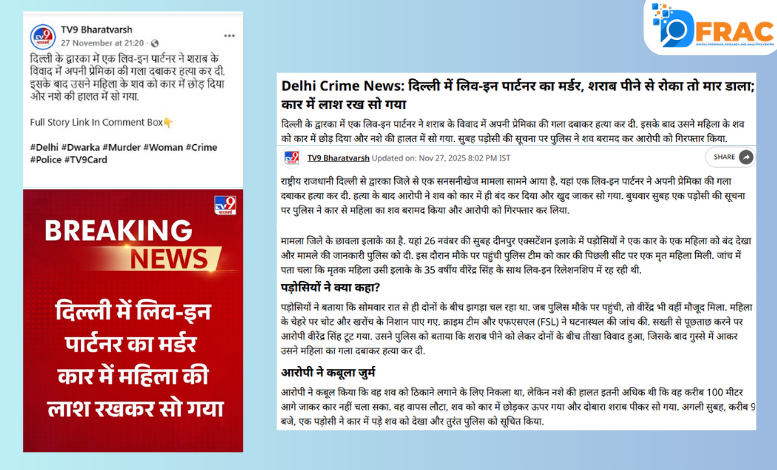 वायरल इंफोग्राफिक पर टीवी-9 भारतवर्ष का लोगो लगा है, जिसके बाद हमारी टीम ने टीवी-9 भारतवर्ष के सोशल मीडिया अकाउंट्स को देखा। हमें यह इंफोग्राफिक टीवी-9 भारतवर्ष के फेसबुक अकाउंट पर पोस्ट मिला, जिसके साथ एक खबर का लिंक भी दिया गया था। इस लिंक को ओपेन करने पर हमें पूरी खबर मिली, जिसमें बताया गया है कि द्वारका जिले के छावला इलाके में यह 26 नवंबर की घटना है। पुलिस टीम को कार की पिछली सीट पर एक मृत महिला मिली, पुलिस की जांच में पता चला कि मृतक महिला उसी इलाके के वीरेंद्र सिंह के साथ लिव-इन रिलेशनशिप में रह रही थी। पुलिस ने जब घटना के बारे में सख्ती से पूछताछ की, तो आरोपी वीरेंद्र सिंह टूट गया। उसने पुलिस को बताया कि शराब पीने को लेकर दोनों के बीच तीखा विवाद हुआ, जिसके बाद गुस्से में आकर उसने महिला का गला दबाकर हत्या कर दी।
