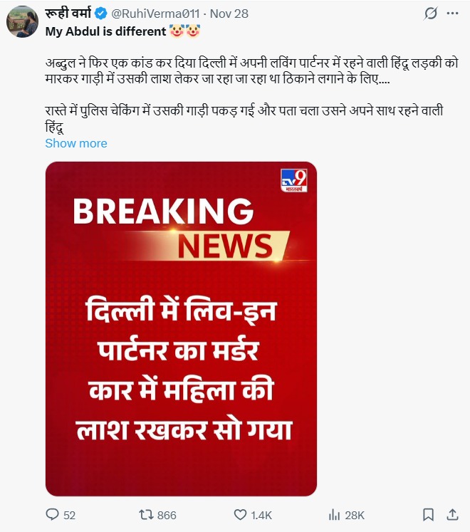 इंफोग्राफिक को शेयर करते हुए रूही वर्मा नामक यूजर ने लिखा, ‘My Abdul is different..अब्दुल ने फिर एक कांड कर दिया दिल्ली में अपनी लविंग पार्टनर में रहने वाली हिंदू लड़की को मारकर गाड़ी में उसकी लाश लेकर जा रहा जा रहा था ठिकाने लगाने के लिए…. रास्ते में पुलिस चेकिंग में उसकी गाड़ी पकड़ गई और पता चला उसने अपने साथ रहने वाली हिंदू महिला को मार दिया है…’