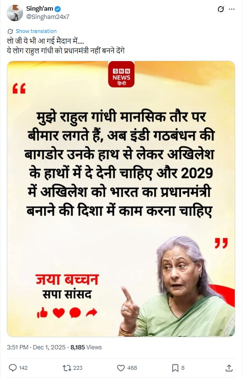वायरल पोस्टकार्ड में लिखा है, ‘मुझे राहुल गांधी मानसिक तौर पर बीमार लगते हैं, अब इंडी गठबंधन की बागडोर उनके हाथ से लेकर अखिलेश के हाथों में दे देनी चाहिए और 2029 में अखिलेश को भारत का प्रधानमंत्री बनाने की दिशा में काम करना चाहिए- जया बच्चन, सपा सांसद’। इस पोस्टकार्ड को शेयर करते हुए एक यूजर ने लिखा, ‘लो जी ये भी आ गई मैदान में…. ये लोग राहुल गांधी को प्रधानमंत्री नहीं बनने देंगे’