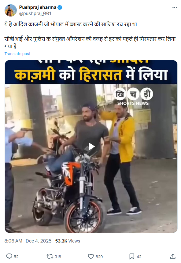 इस वीडियो को शेयर करते हुए पुष्पराज शर्मा नामक यूजर ने लिखा, ‘ये है आदिल काजमी जो भोपाल में ब्लास्ट करने की साजिश रच रहा था सीबीआई और पुलिस के संयुक्त ऑपरेशन की वजह से इसको पहले ही गिरफ्तार कर लिया गया है।’