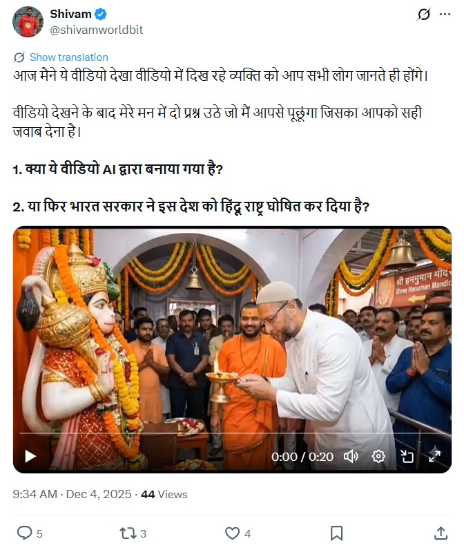 DFRAC के फैक्ट चेक से साफ है कि AIMIM चीफ असदुद्दीन ओवैसी का हनुमान आरती करने का वायरल वीडियो AI-जनरेटेड है। इसलिए सोशल मीडिया यूजर्स का दावा गलत है।