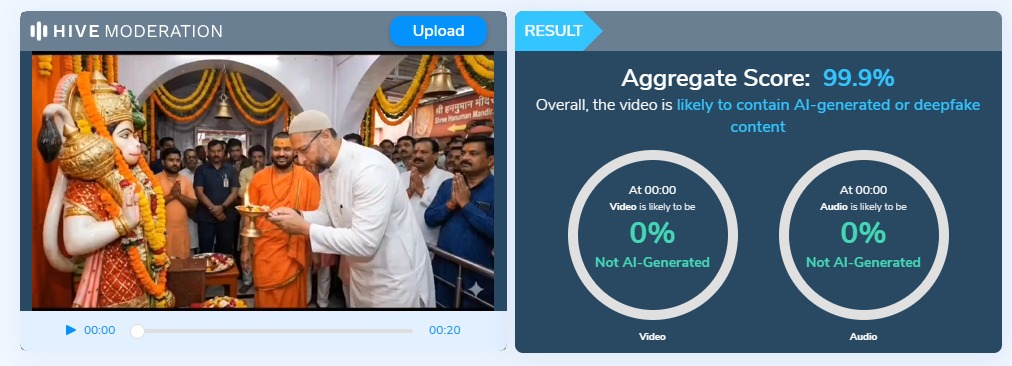 DFRAC की टीम ने जांच में पाया कि वायरल वीडियो AI-जनरेटेड है। वीडियो को गौर से देखने पर हमारी टीम ने पाया कि वीडियो में कई असमानताएं हैं, जैसे असदुद्दीन ओवेसी का बदलता हुआ चेहरा और आस-पास खड़े लोगों का स्थान बदल रहा है। इसके बाद हमारी टीम ने वायरल वीडियो की एआई डिटेक्टर टूल हाइव मॉडरेशन पर जांच की। हमारी जांच में परिणाम सामने आया कि इस वीडियो के AI-जनरेटेड होने के चांस 99.9 प्रतिशत है।