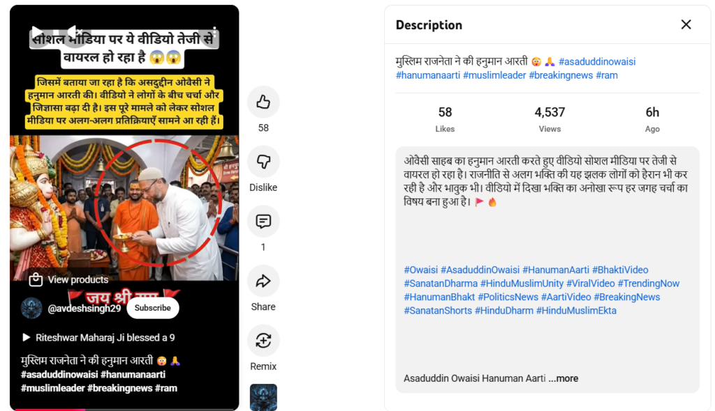 इसके अलावा असदुद्दीन ओवैसी का यह यूट्यूब पर भी अपलोड किया गया है, जिसपर टेक्स्ट लिखा है, ‘सोशल मीडिया पर ये वीडियो तेजी से वायरल हो रहा है..जिसमें बताया जा रहा है कि असदुद्दीन ओवैसी ने हनुमान आरती की। वीडियो ने लोगों के बीच चर्चा और जिज्ञासा बढ़ा दी है। इस पूरे मामले को लेकर सोशल मीडिया पर अलग-अलग प्रतिक्रियाएँ सामने आ रही हैं।’