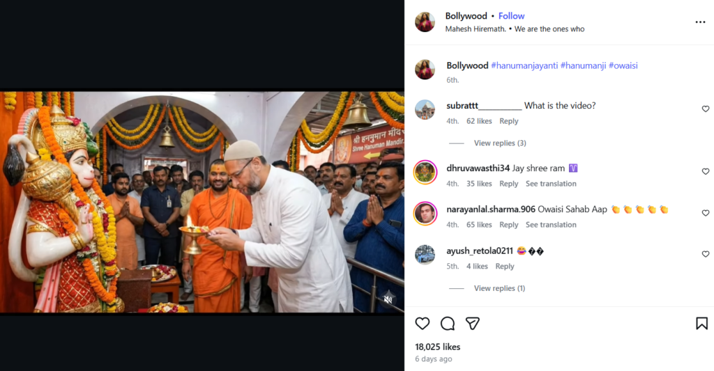 सोशल मीडिया पर AIMIM चीफ असदुद्दीन ओवैसी का एक वीडियो वायरल है। इस वीडियो में ओवैसी को एक मंदिर में हनुमान आरती करते हुए देखा जा सकता है। इस वीडियो को इंस्टाग्राम पर एक यूजर ने शेयर किया है, जिसे अब तक 18 हजार से ज्यादा बार लाइक किया गया है और 1 लाख 90 हजार से ज्यादा बार देखा गया है।