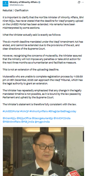 वायरल दावे की जांच के लिए DFRAC ने दावे से जुड़े कुछ कीवर्ड गूगल पर सर्च किये। इस दौरान हमें X पर अल्पसंख्यक मामलों का मंत्रालय का एक पोस्ट मिला। इस पोस्ट में स्पष्टीकरण देते हुए कहा गया कि यह साफ़ करना ज़रूरी है कि अल्पसंख्यक मामलों के माननीय मंत्री, श्री किरेन रिजिजू ने कभी यह नहीं कहा कि UMEED पोर्टल पर वक्फ संपत्ति अपलोड करने की डेडलाइन बढ़ा दी गई है। उनके बयानों को कुछ लोगों ने गलत समझा है। मंत्री ने असल में जो कहा वह बिल्कुल इस प्रकार है: वक्फ संशोधन अधिनियम के तहत तय छह महीने की डेडलाइन खत्म हो गई है, और अधिनियम के प्रावधानों और सुप्रीम कोर्ट के साफ़ निर्देशों के कारण इसे बढ़ाया नहीं जा सकता। हालांकि, मुतवल्लियों की चिंताओं को समझते हुए, मंत्री ने भरोसा दिलाया कि मंत्रालय मानवीय और सुविधा देने वाले कदम के तौर पर अगले तीन महीनों तक कोई पेनल्टी नहीं लगाएगा या कोई सख्त कार्रवाई नहीं करेगा। यह अपलोडिंग डेडलाइन का विस्तार नहीं है। जो मुतवल्ली 6 दिसंबर, 2025 को रात 11:59:59 बजे तक रजिस्ट्रेशन प्रक्रिया पूरी नहीं कर पाते हैं, वे वक्फ ट्रिब्यूनल से संपर्क कर सकते हैं, जिसके पास एक्सटेंशन देने का कानूनी अधिकार है। मंत्री ने बार-बार इस बात पर ज़ोर दिया है कि कानूनी तौर पर तय समय सीमा में कोई भी बदलाव संभव नहीं है, क्योंकि यह संसद द्वारा पारित और सुप्रीम कोर्ट द्वारा बरकरार रखे गए कानून से बंधा हुआ है। इसलिए मंत्री का बयान पूरी तरह से कानून के मुताबिक है।