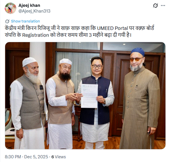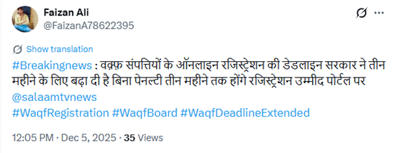 सोशल साइट X पर वेरिफाइड यूजर साडा टाइम ने लिखा कि उम्मीद पोर्टल पर वक्फ प्रॉपर्टी के रजिस्ट्रेशन की तारीख बढ़ी, अगले तीन महीनों तक बिना जुर्माने के रजिस्ट्रेशन कर सकेंगे।