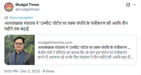 वहीं न्यूज़ पोर्टल मुदगल टाइम्स ने लिखा कि अल्पसंख्यक मंत्रालय ने ‘उम्मीद’ पोर्टल पर वक्फ संपत्ति के पंजीकरण की अवधि तीन महीने तक बढ़ाई