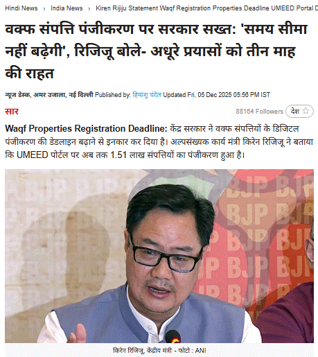 इसके साथ ही हमें न्यूज़ पेपर अमर उजाला की रिपोर्ट मिली। जिसमे अल्पसंख्यक कार्य मंत्री किरेन रिजिजू ने बताया कि UMEED पोर्टल पर वक्फ संपत्तियों को अपलोड करने की छह माह की समय सीमा शुक्रवार को समाप्त हो गई। उन्होंने स्पष्ट किया कि सुप्रीम कोर्ट के निर्देशों के चलते समय सीमा बढ़ाना संभव नहीं है। रिजिजू ने कहा कि शुक्रवार सुबह तक 1.51 लाख संपत्तियों का ही पंजीकरण हो सका, जबकि देशभर में नौ लाख से अधिक संपत्तियों को सूचीबद्ध किया जाना है। रिजिजू ने कहा कि जो ‘मुतवल्ली’ पंजीकरण की कोशिश कर चुके हैं लेकिन प्रक्रिया पूरी नहीं कर पाए, उन्हें तीन महीनों तक किसी भी प्रकार का दंड नहीं लगाया जाएगा। उन्होंने भरोसा दिलाया कि ऐसे मामलों के लिए सरकार समाधान खोजेगी और उन्हें पूरा समय दिया जाएगा। हालांकि, जिन लोगों ने बिल्कुल भी पंजीकरण की कोशिश नहीं की है, उन्हें अपने वक्फ ट्रिब्यूनल से संपर्क करना होगा। रिजिजू ने दोहराया कि सुप्रीम कोर्ट ने साफ कर दिया है कि पंजीकरण की तारीख नहीं बढ़ाई जा सकती। इसलिए केंद्र के पास समय सीमा बढ़ाने का कोई विकल्प नहीं है। उन्होंने कहा कि सरकार नियमों का पालन करवाएगी, लेकिन जिन लोगों ने ईमानदारी से प्रक्रिया शुरू की थी, उनके साथ नरमी बरती जाएगी।
