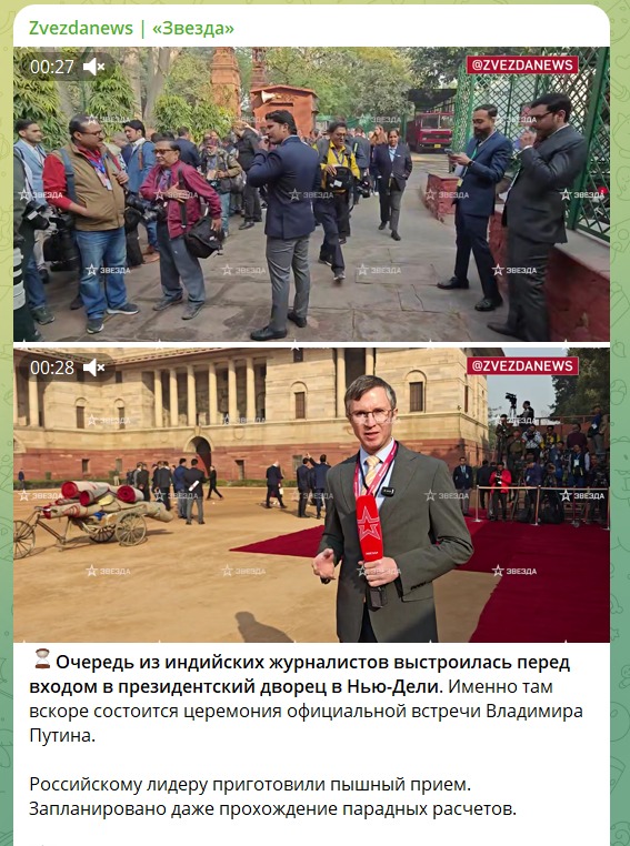 ZVEZDA NEWS के टेलीग्राम चैनल पर वायरल तस्वीर की पूरी कवरेज का वीडियो मिला, जिसके साथ जानकारी दी गई है, ‘नई दिल्ली में राष्ट्रपति भवन के सामने भारतीय पत्रकारों की लाइन लगी हुई है। व्लादिमीर पुतिन के लिए आधिकारिक स्वागत समारोह जल्द ही वहीं होगा। रूसी नेता का शानदार स्वागत किया जा रहा है। गार्ड्स ऑफ ऑनर की परेड भी प्लान की गई है।’