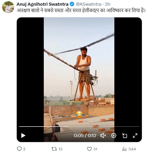 वीडियो शेयर करते हुए Anuj Agnihotri Swatntra नामक एक एक्स (पूर्व ट्विटर) यूजर ने लिखा, ‘आरक्षण बालो ने सबसे सस्ता और सरल हेलीकाप्टर का आविष्कार कर लिया है।’