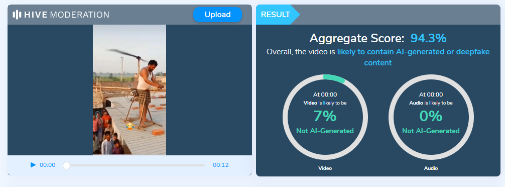 DFRAC की टीम ने वायरल वीडियो की जांच में पाया कि यह किसी वास्तविक घटना का वीडियो नहीं है। इस वीडियो को AI टूल्स के माध्यम से बनाया गया है। हमारी टीम ने AI-डिटेक्टर टूल हाइव मॉडरेशन पर जब इस वीडियो की जांच की परिणाम सामने आया कि यह AI-जनरेटेड वीडियो है। रिजल्ट में वायरल वीडियो के 94.3% AI-जनरेटेड होने के चांस पाए गए।