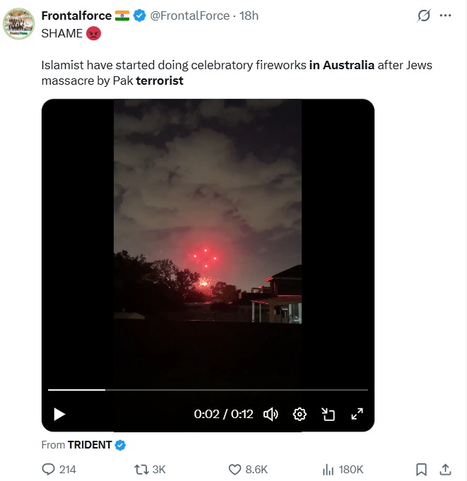 इस वीडियो को शेयर करते हुए Frontalforce नामक यूजर ने लिखा, ‘शर्मनाक। पाकिस्तानी आतंकवादियों द्वारा यहूदियों के नरसंहार के बाद इस्लामवादियों ने ऑस्ट्रेलिया में जश्न में आतिशबाजी करना शुरू कर दिया है।’ (हिन्दी अनुवाद)