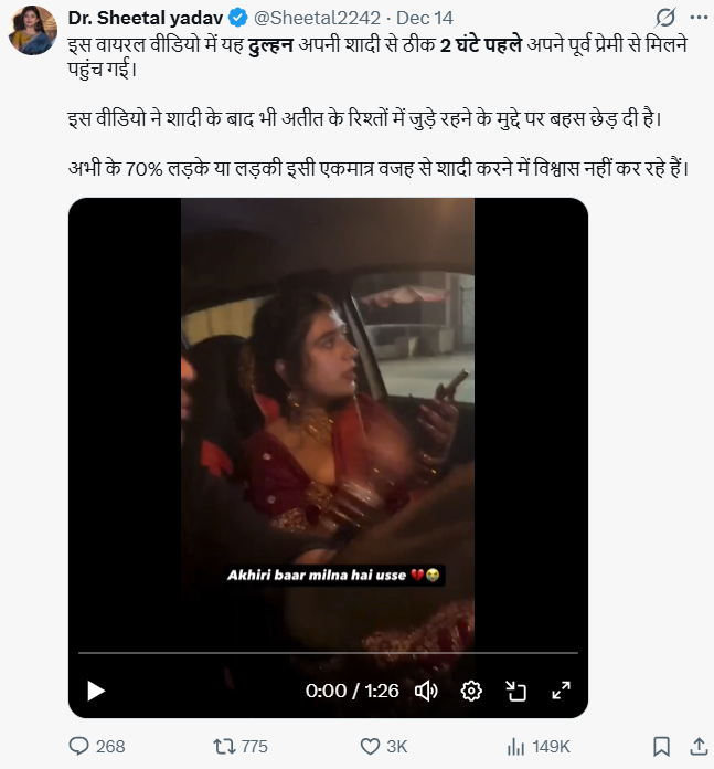 इस वीडियो को शेयर करते हुए एक यूजर ने लिखा, ‘इस वायरल वीडियो में यह दुल्हन अपनी शादी से ठीक 2 घंटे पहले अपने पूर्व प्रेमी से मिलने पहुंच गई। इस वीडियो ने शादी के बाद भी अतीत के रिश्तों में जुड़े रहने के मुद्दे पर बहस छेड़ दी है। अभी के 70% लड़के या लड़की इसी एकमात्र वजह से शादी करने में विश्वास नहीं कर रहे हैं।’