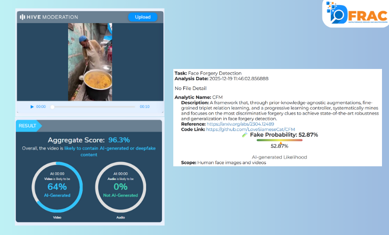 DFRAC की टीम ने वायरल वीडियो की जांच में पाया कि यह AI-जनरेटेड वीडियो है, जिसे मुस्लिम व्यक्ति के साथ जोड़कर सांप्रदायिक दावे के साथ शेयर किया गया है। हमारी टीम ने वीडियो की जांच AI-डिटेक्टर टूल्स हाइव मॉडरेशन और डीपफेक-ओ-मीटर पर की। इन AI-टूल्स की जांच में परिणाम सामने आया कि यह AI-जनरेटेड वीडियो है।