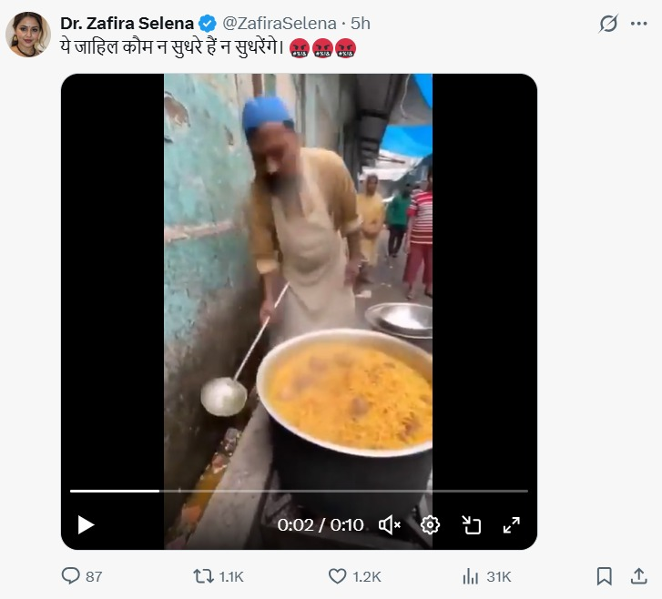 सोशल मीडिया पर शेयर किए गए एक वीडियो में देखा जा सकता है कि एक मुस्लिम शख्स नाली के पानी से खाना पका रहा है। यूजर्स इस वीडियो को सांप्रदायिक रंग देकर शेयर कर रहे हैं। डॉ. जफीरा सेलेना नामक यूजर ने वीडियो शेयर करते हुए लिखा, ‘ये जाहिल कौम न सुधरे हैं न सुधरेंगे।’