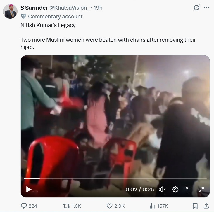 सोशल मीडिया पर एक वीडियो शेयर किया जा रहा है, जिसे भारत का बताकर और बिहार के सीएम नीतीश कुमार से जोड़ते हुए शेयर किया गया है। इस वीडियो के साथ दावा है कि भीड़ द्वारा दो मुस्लिम महिलाओं की हिजाब उतारकर पिटाई की गई। वहीं कई यूजर्स ने इस वीडियो को बांग्लादेश में बुर्का नहीं पहनने पर महिलाओं की पिटाई का बताकर शेयर किया है।