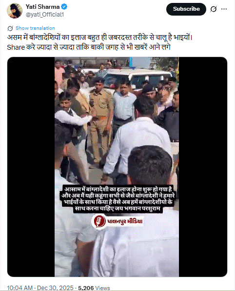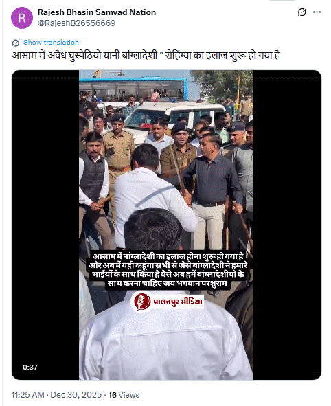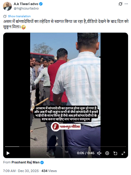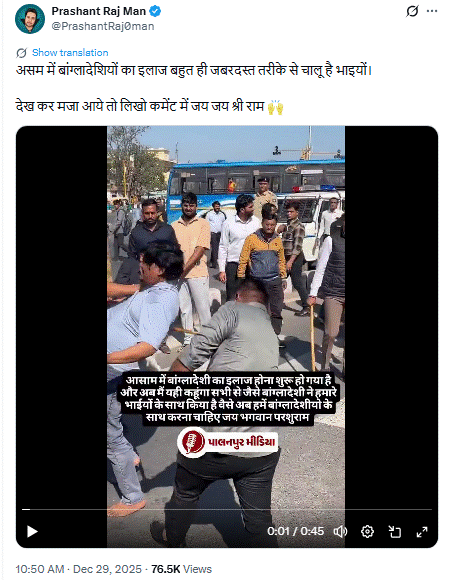 सोशल साईट X पर वेरिफाइड यूजर प्रशांत राज मन ने वायरल वीडियो को शेयर करते हुए लिखा कि असम में बांग्लादेशियों का इलाज बहुत ही जबरदस्त तरीके से चालू है भाइयों। देख कर मजा आये तो लिखो कमेंट में जय जय श्री राम