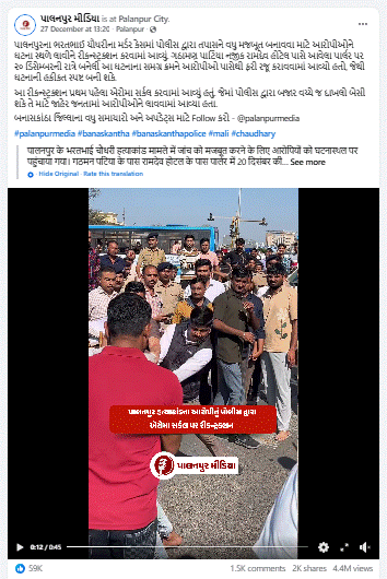 साथ ही वीडियो के बारे में गुजराती भाषा में लिखा गया कि પાલનપુરના ભરતભાઈ ચૌધરીના મર્ડર કેસમાં પોલીસ દ્વારા તપાસને વધુ મજબૂત બનાવવા માટે આરોપીઓને ઘટના સ્થળે લાવીને રીકન્સ્ટ્રક્શન કરવામાં આવ્યું. ગઠામણ પાટિયા નજીક રામદેવ હોટેલ પાસે આવેલા પાર્લર પર ૨૦ ડિસેમ્બરની રાત્રે બનેલી આ ઘટનાના સમગ્ર ક્રમને આરોપીઓ પાસેથી ફરી રજૂ કરાવવામાં આવ્યો હતો, જેથી ઘટનાની હકીકત સ્પષ્ટ બની શકે. આ રીકન્સ્ટ્રક્શન પ્રથમ પહેલા એરોમા સર્કલ કરવામાં આવ્યું હતું. જેમાં પોલીસ દ્વારા બજાર વચ્ચે જ દાખલો બેસી શકે તે માટે જાહેર જનતામાં આરોપીઓને લાવવામાં આવ્યા હતા. બનાસકાંઠા જિલ્લાના વધુ સમાચારો અને અપડેટ્સ માટે (अनुवाद – पालनपुर के भरतभाई चौधरी की हत्या के मामले में पुलिस जांच को मजबूत करने के लिए आरोपियों को घटनास्थल पर लाई। 20 दिसंबर की रात घटमान पाटिया के पास रामदेव होटल के पास पार्लर में हुई घटना का पूरा सीक्वेंस आरोपियों से रीक्रिएट किया गया, ताकि घटना के तथ्य साफ हो सकें। यह रीकंस्ट्रक्शन सबसे पहले अरोमा सर्कल में किया गया। जिसमें आरोपियों को लोगों के सामने लाया गया ताकि पुलिस बीच बाजार में बैठ सके। बनासकांठा जिले से और खबरों और अपडेट के लिए)