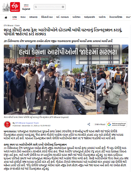 वहीं आगे की जांच में हमें घटना से जुड़ी ईटीवी भारत की एक अन्य रिपोर्ट मिली। इस रिपोर्ट में भी बताया गया कि पालनपुर के गदलवाड़ा के एक युवक की हत्या के मामले में गिरफ्तार किए गए छह लोगों को आज पुलिस ने घटनास्थल पर ले जाकर रीक्रिएशन किया। जिसमें मौजूद लोगों ने अपना गुस्सा जाहिर किया और मांग की कि इन लोगों को सख्त से सख्त सजा और मौत की सजा दी जाए। घटना के रीक्रिएशन के दौरान पुलिस ने आरोपियों को मौके पर ही लाठियों से पीटा।