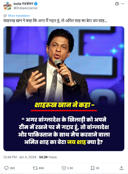 बांग्लादेश में हिन्दुओं पर बढ़ते हमले के बीच शाहरुख खान की IPL टीम कोलकाता नाइट राइडर्स (KKR) में बांग्लादेशी क्रिकेटर मुस्तफिजुर रहमान को रखे जाने को लेकर काफी बवाल मचा था। शाहरुख खान को एंटी नेशनल तक कहा गया। हालांकि विवाद बढ़ने पर बीसीसीआई के निर्देश पर KKR ने मुस्तफिजुर रहमान को रिलीज कर दिया है। इस बीच सोशल मीडिया पर शाहरुख के एक बयान का पोस्टकार्ड वायरल हो रहा है, जिसमें शाहरुख को आईसीसी चेयरमैन जय शाह पर निशाना साधते हुए देखा जा सकता है।