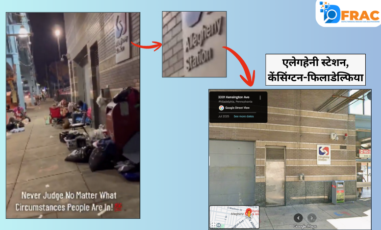 वहीं हमने वीडियो के बारे जांच के लिए वीडियो को गौर से देखा। हमने पाया कि वीडियो में एलेगहेनी स्टेशन का बोर्ड दिख रहा है। हमने जांच में पाया कि एलेगहेनी स्टेशन, केंसिंग्टन-फिलाडेल्फिया में स्थित है। हमने गूगल मैप उसी लोकेशन को सर्च किया और पाया कि यह स्टेशन केंसिंग्टन में ही स्थित है, जिसे यहां दिए ग्राफिक्स में देखा जा सकता है।