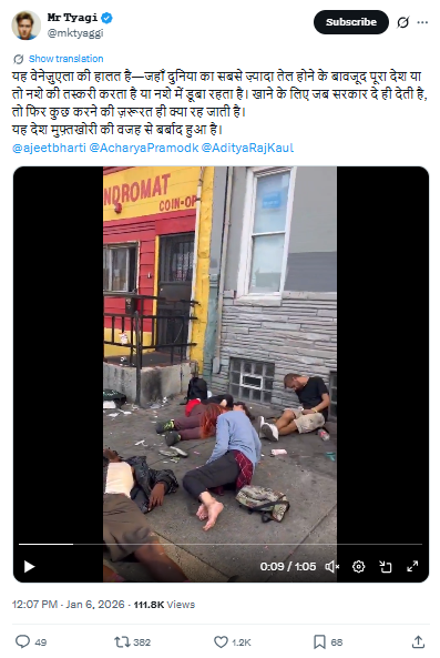 मिस्टर त्यागी नामक यूजर ने वीडियो शेयर करते हुए लिखा, ‘यह वेनेज़ुएला की हालत है—जहाँ दुनिया का सबसे ज़्यादा तेल होने के बावजूद पूरा देश या तो नशे की तस्करी करता है या नशे में डूबा रहता है। खाने के लिए जब सरकार दे ही देती है, तो फिर कुछ करने की ज़रूरत ही क्या रह जाती है। यह देश मुफ़्तखोरी की वजह से बर्बाद हुआ है।’