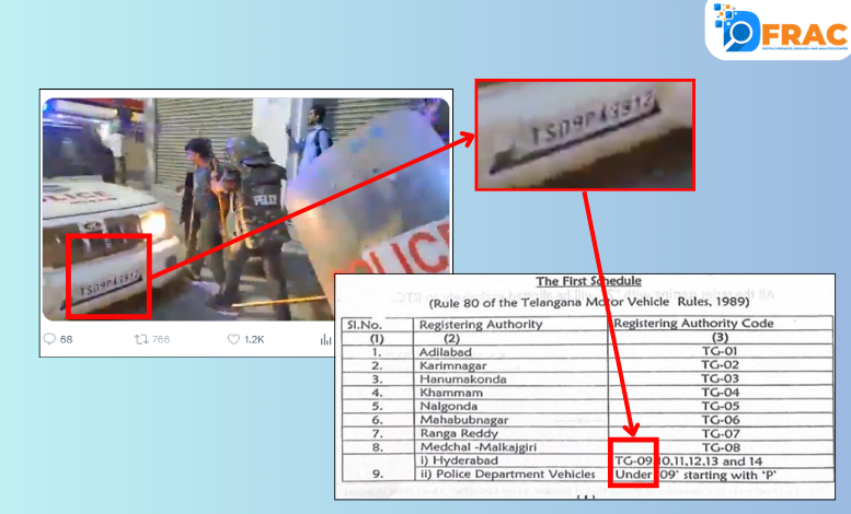 DFRAC की टीम ने वायरल वीडियो की जांच में पाया कि यह वीडियो उत्तर प्रदेश का नहीं है। यह वीडियो तेलंगाना के हैदराबाद का वर्ष 2022 का पुराना वीडियो है। हमारी टीम ने वीडियो को गौर से देखने पर पाया कि पुलिस वाहन पर नंबर की शुरूआत TS से हो रही है, जो तेलंगाना का है। पुलिस वाहन का नंबर TS09 से शुरु हो रहा है, जो हैदराबाद का है। तेलंगाना ट्रांसपोर्ट विभाग के एक गैजेट के अनुसार TS की जगह अब TG कर दिया गया है। इस गैजेट में देखा जा सकता है कि TG09 से लेकर 14 तक हैदराबाद के लिए आवंटित है।